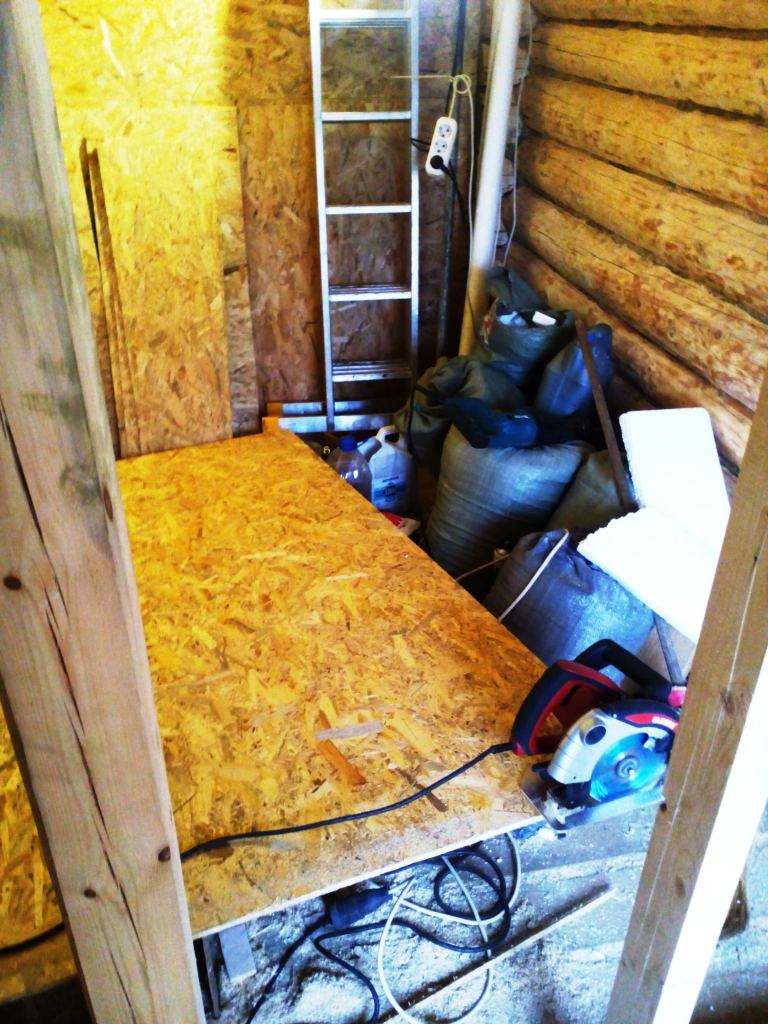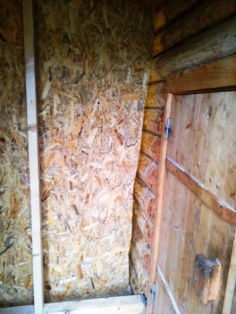 Итак, необходимо было установить перегородку из ОСБ-листа примкнув ее одной стороной к бревенчатому срубу. Другая сторона и середина крепятся к двум стойкам.