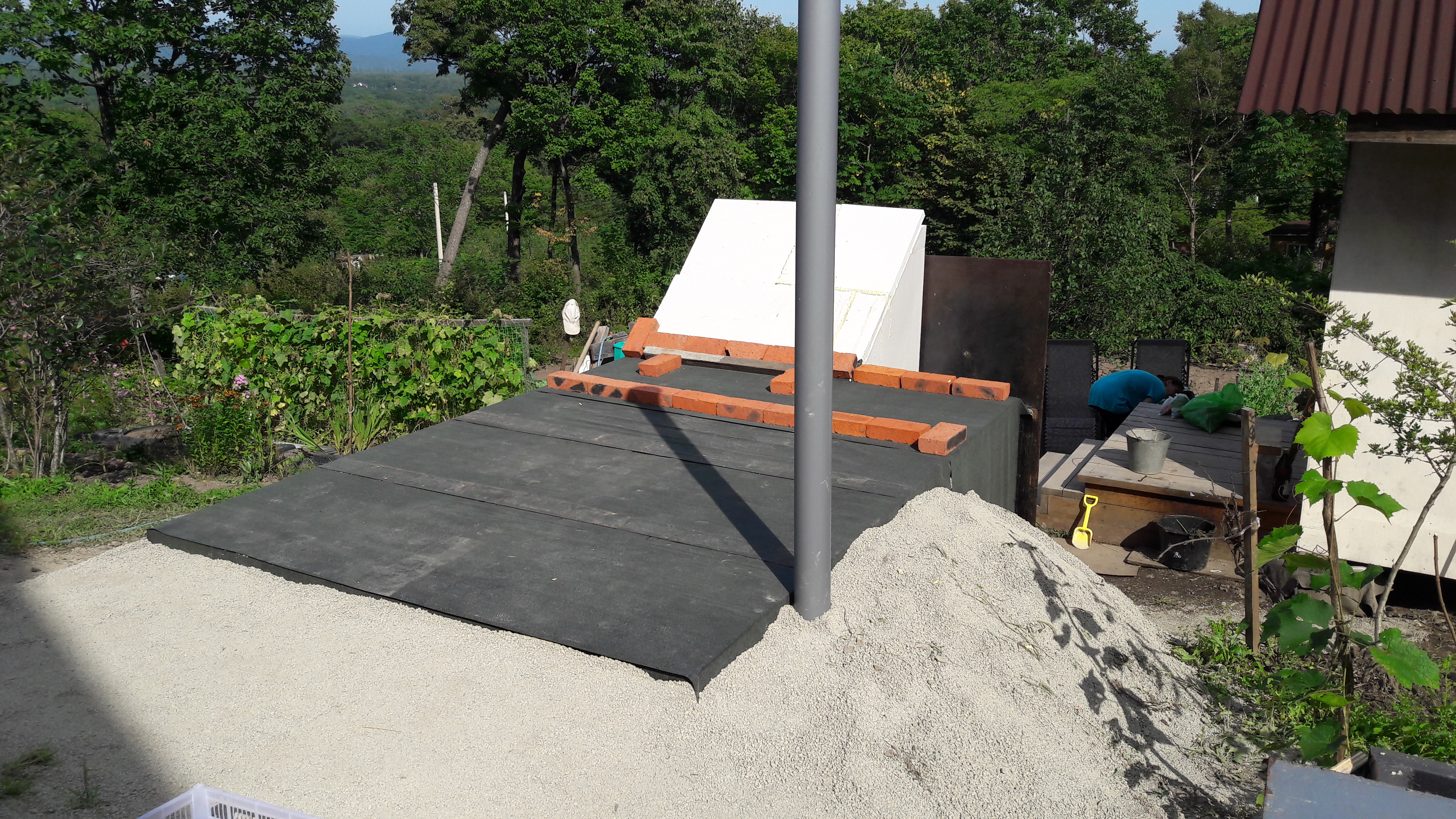 Попутно вопрос. Как офомрить пенопласт тот что вокруг тамбура? Засыпаться оно ничего не будет, сами видите. А пенопласты боятся солнца, нужно как-то защищать, да и белая ерунда стоит отсвечивает не хорошо как-то. Сверху я так же закрою рубероидом, а по стенкам что делать? Просто покрасить гидроизоляцией? рубероид тоже клеить? Что бы вы сделали?
