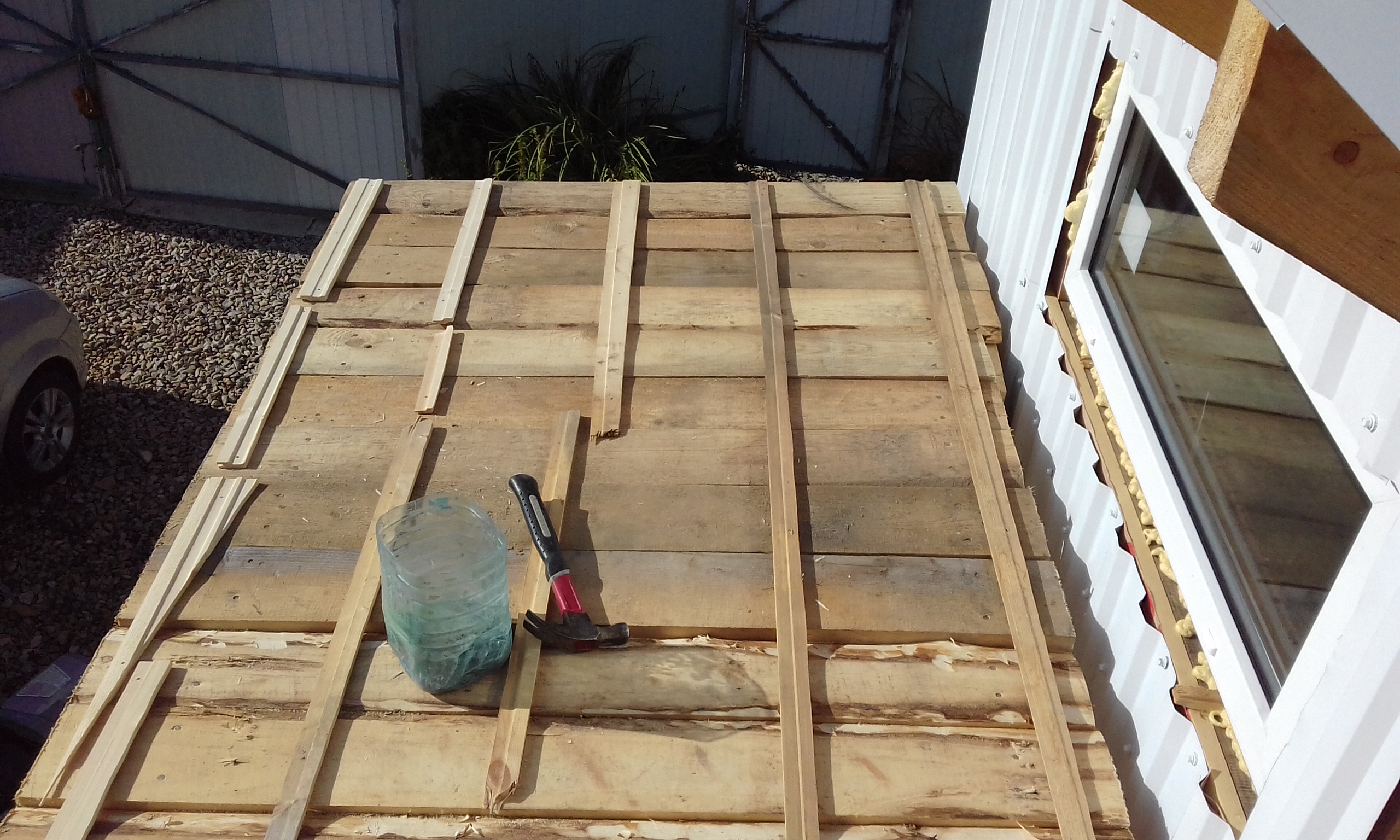 Давно я ждал погожий денёк. И вот он случился. Поспешил настелить кровлю тамбура из профлиста толщиной 0,5 мм по сплошной обрешётке из дюймовки + контробрешётка для проветривания.