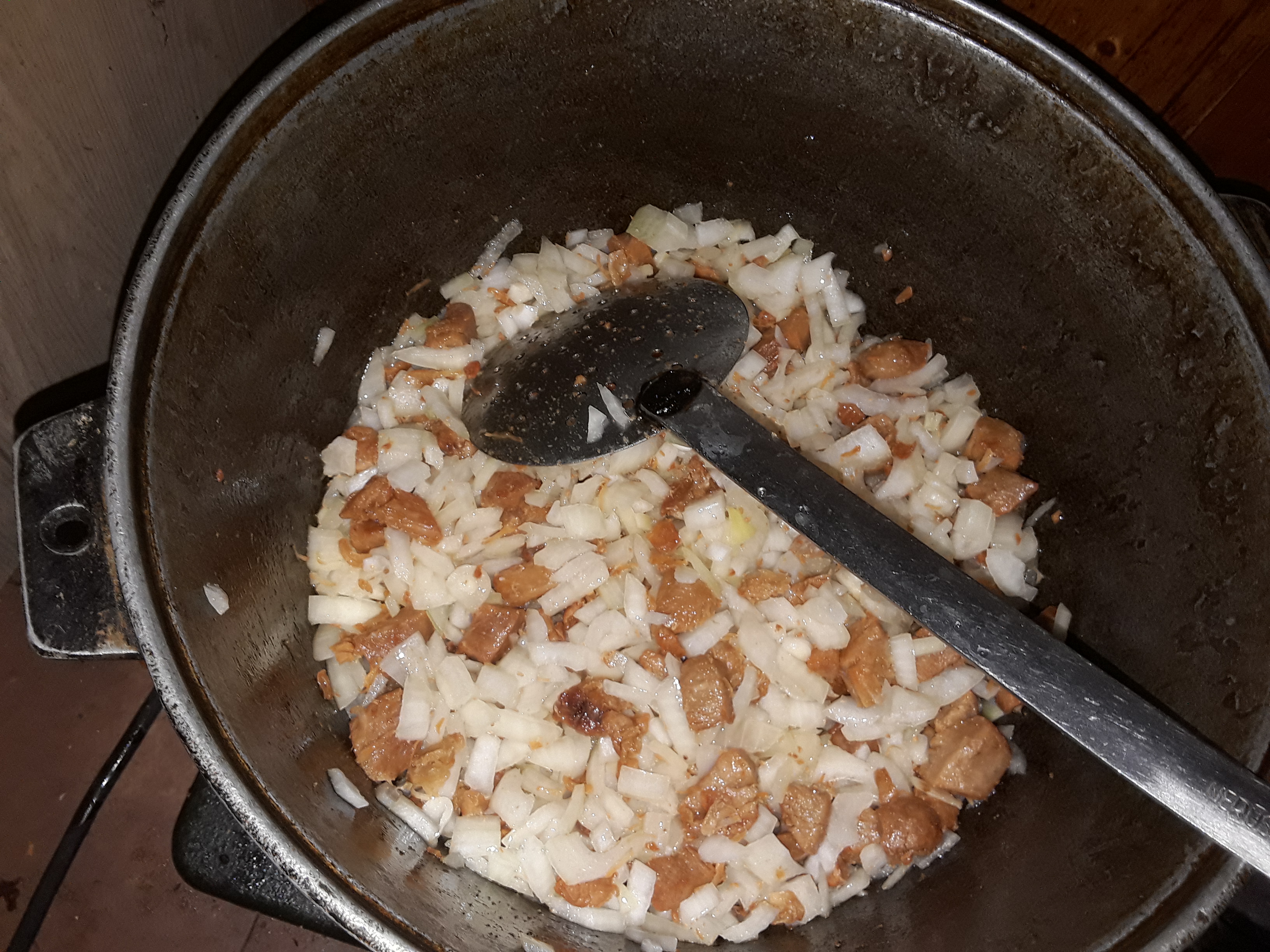 Продолжим,к мясу добавляем лук.