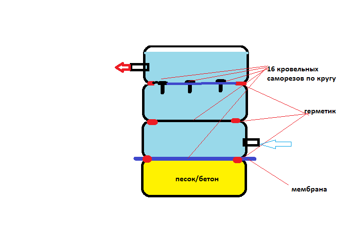 Первое разумное предложениеonozdrachoff писал(а): ↑01 фев 2018, 20:52Делаем колонну из ..5-10 покрышек соединяя между собой на саморезы с промазкой стыка герметиком. Нижнюю закапываем-засыпаем или бетонируем-это фундамент. На него укладываем ПВХ-мембрану внапуск, мажем торец следующей покрышки герметиком и на саморезы к фундаменту-это дно. Дальше заливаем воду и обеспечиваем циркуляцию с солнечной батареей и потребителем. Полкуба в грузовую влезет, тяжестью стыки зажмет.