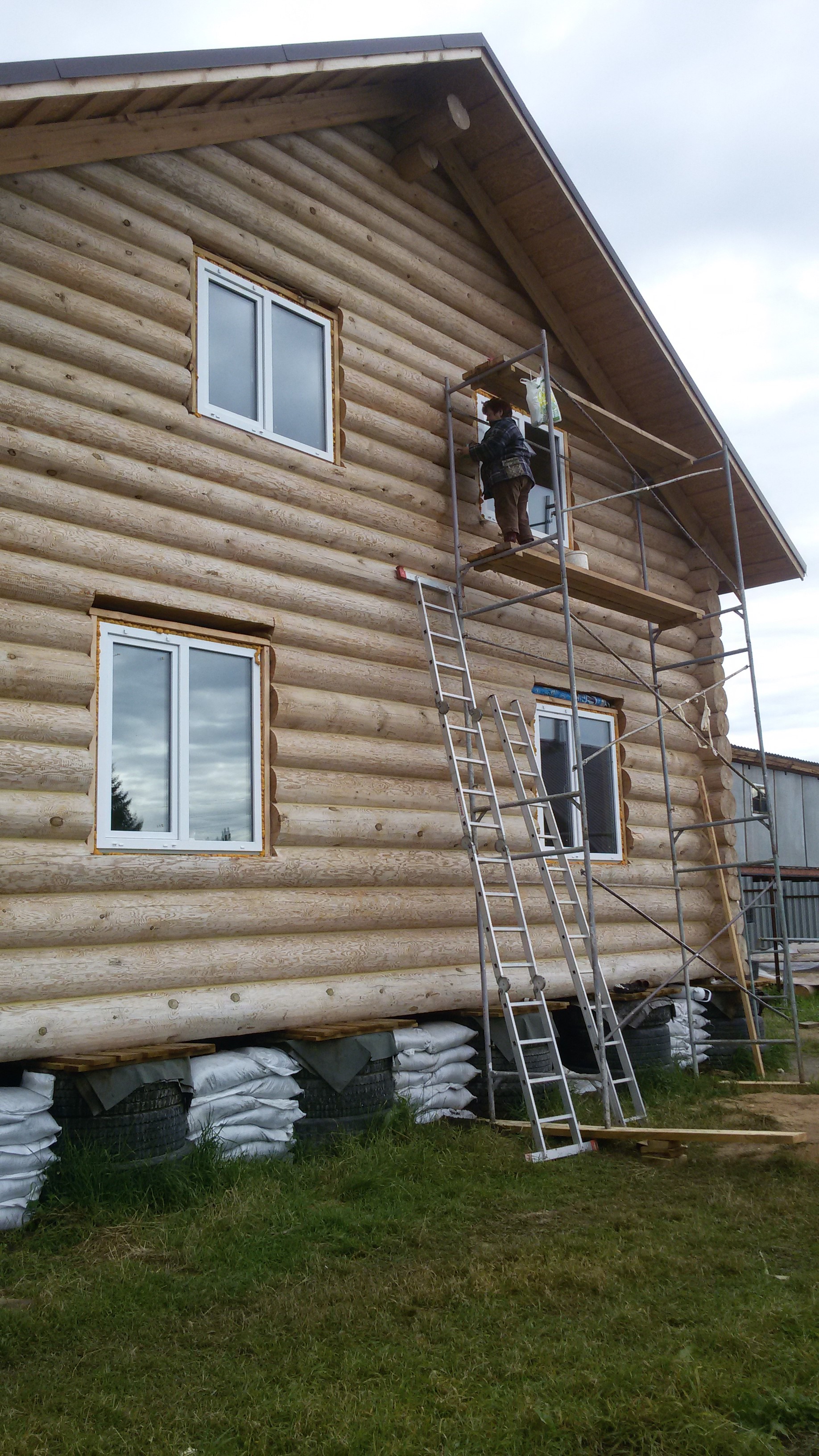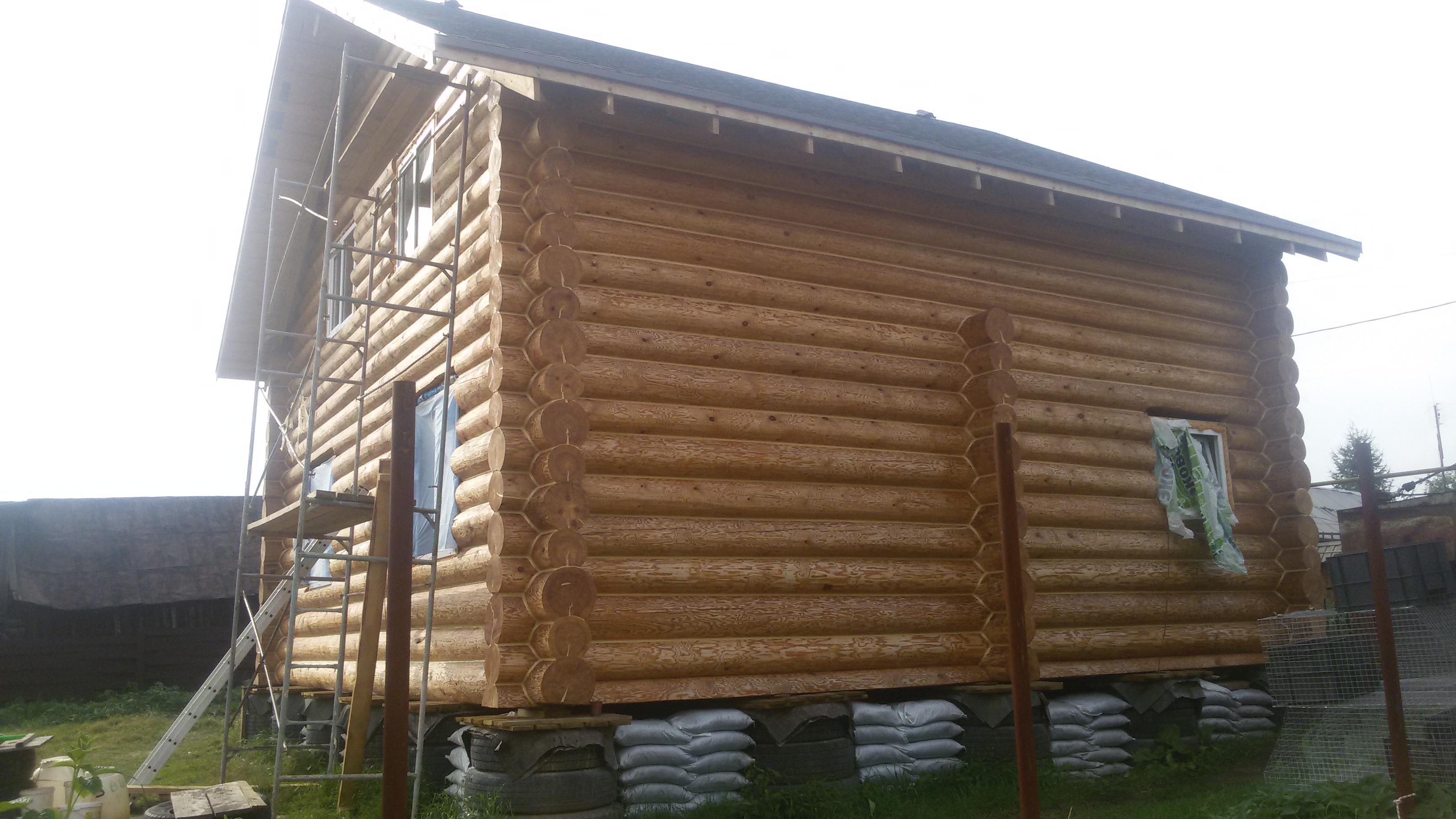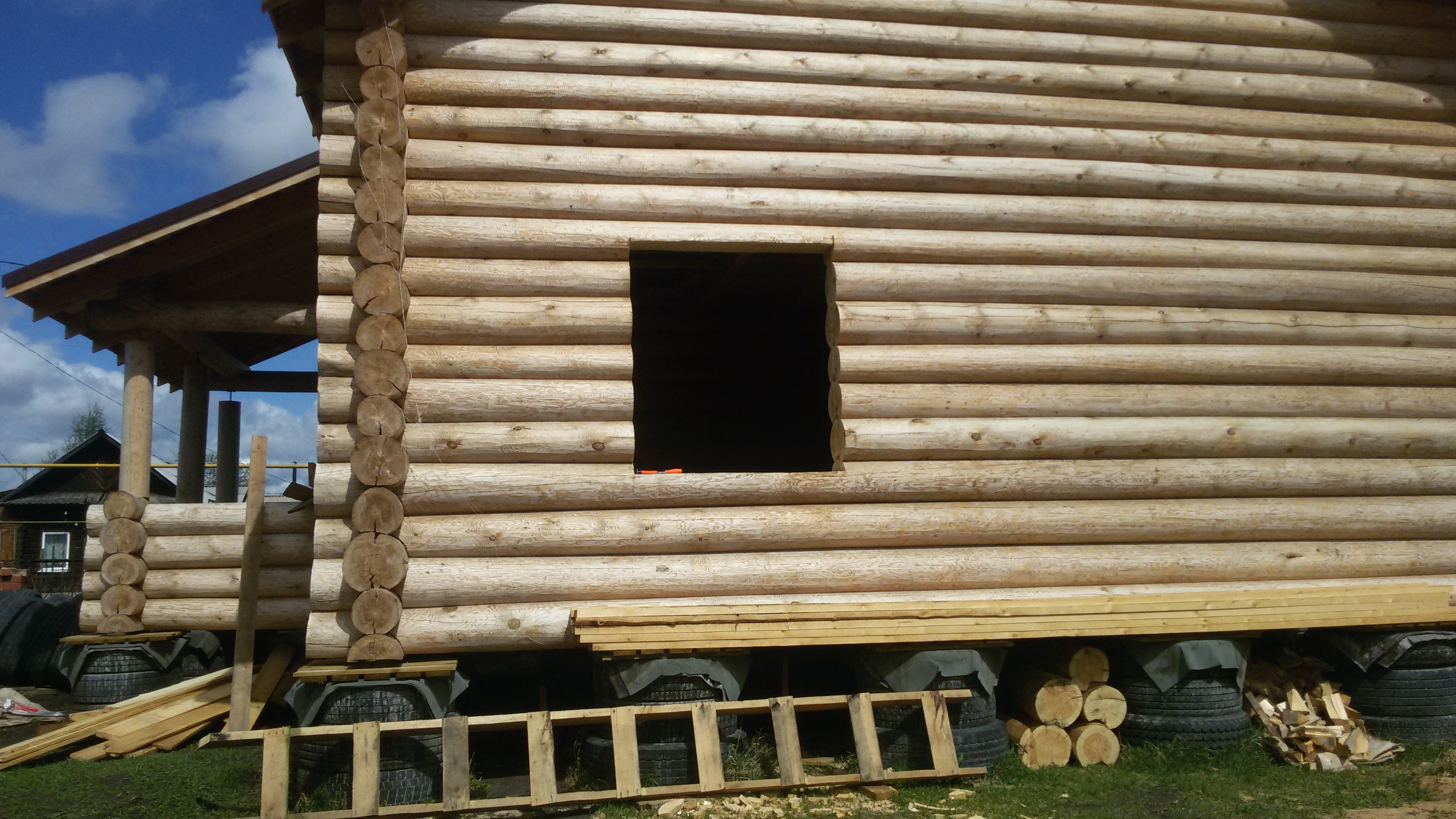 Бревенчатый дом на фундаменте из покрышек