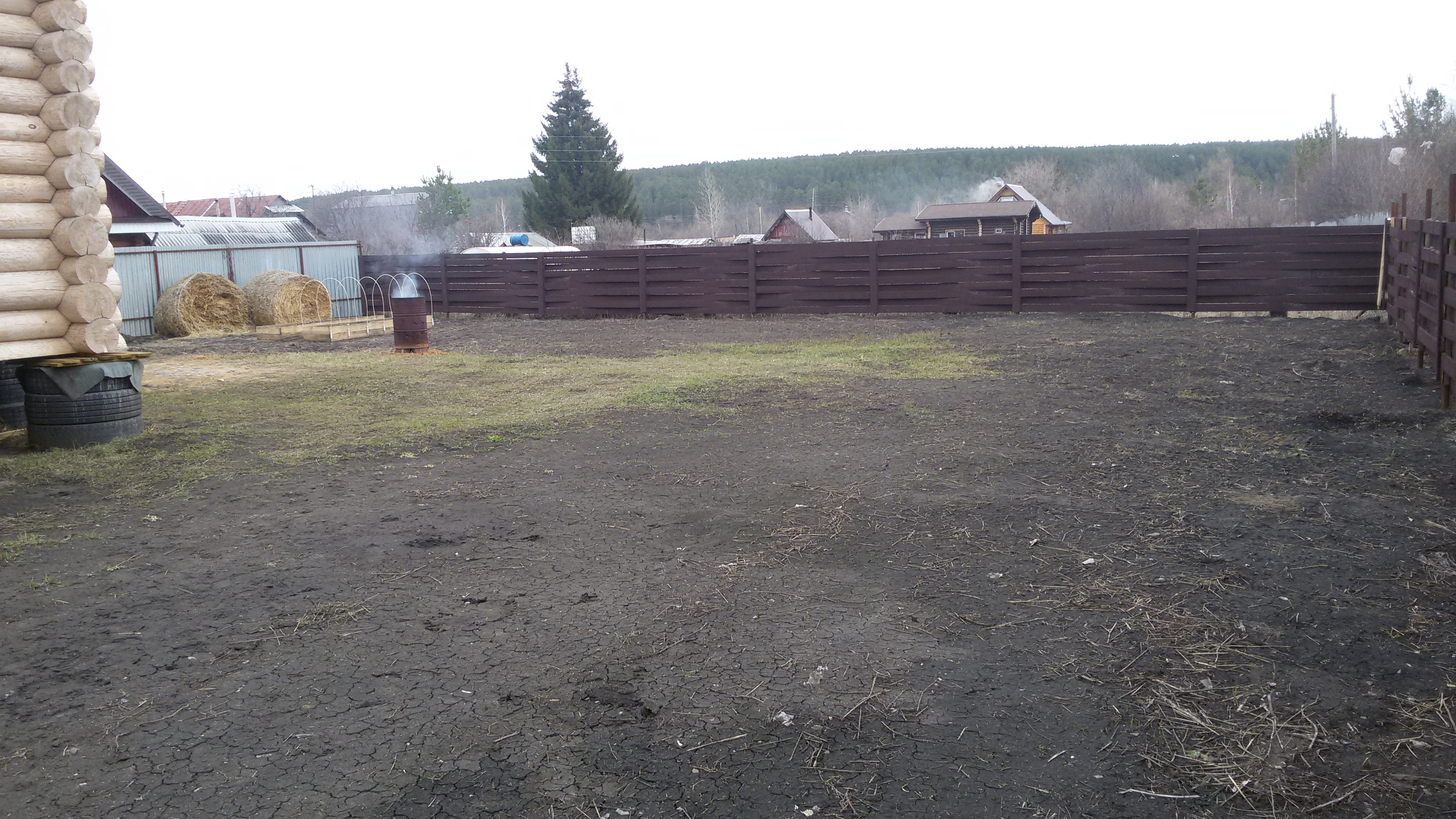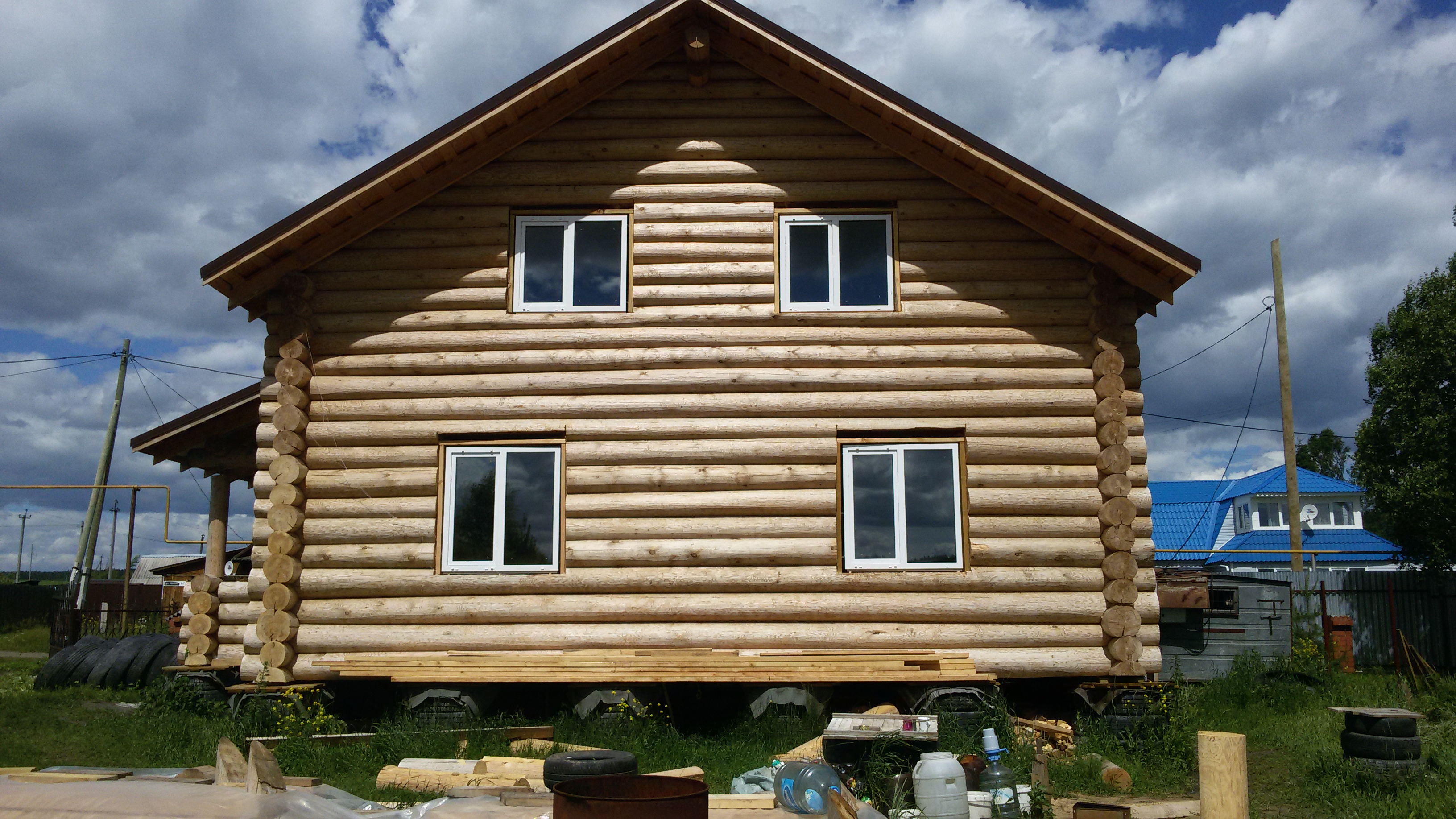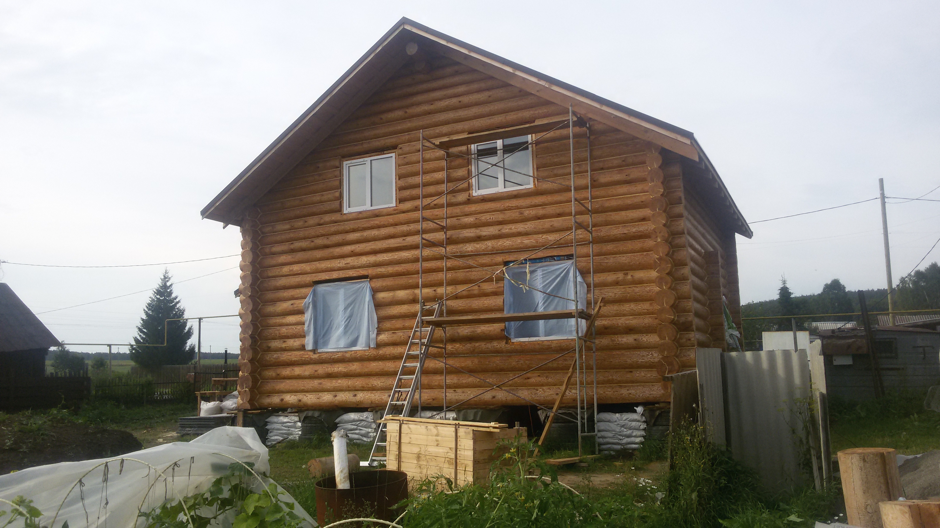 Бревенчатый дом на фундаменте из покрышек