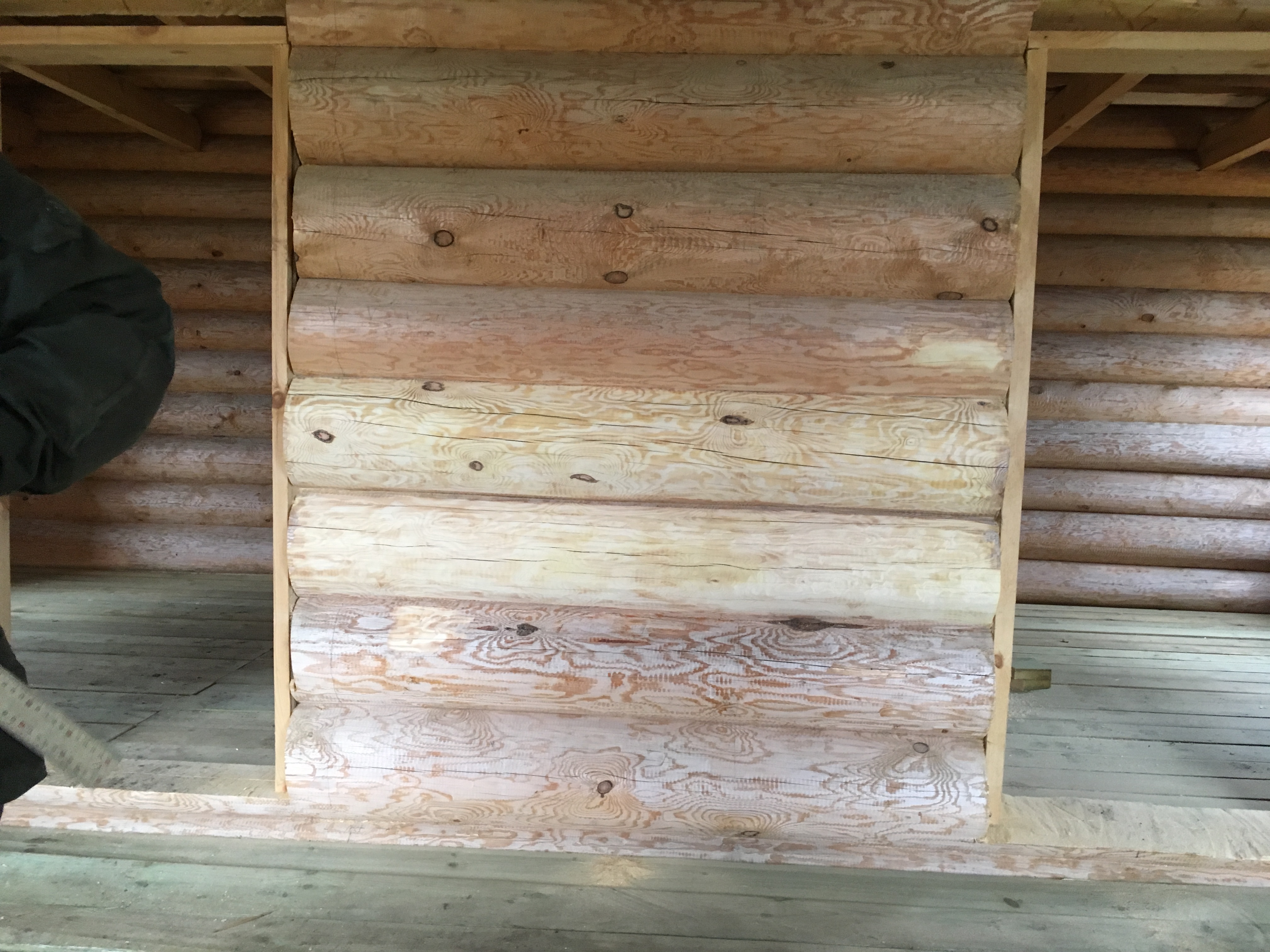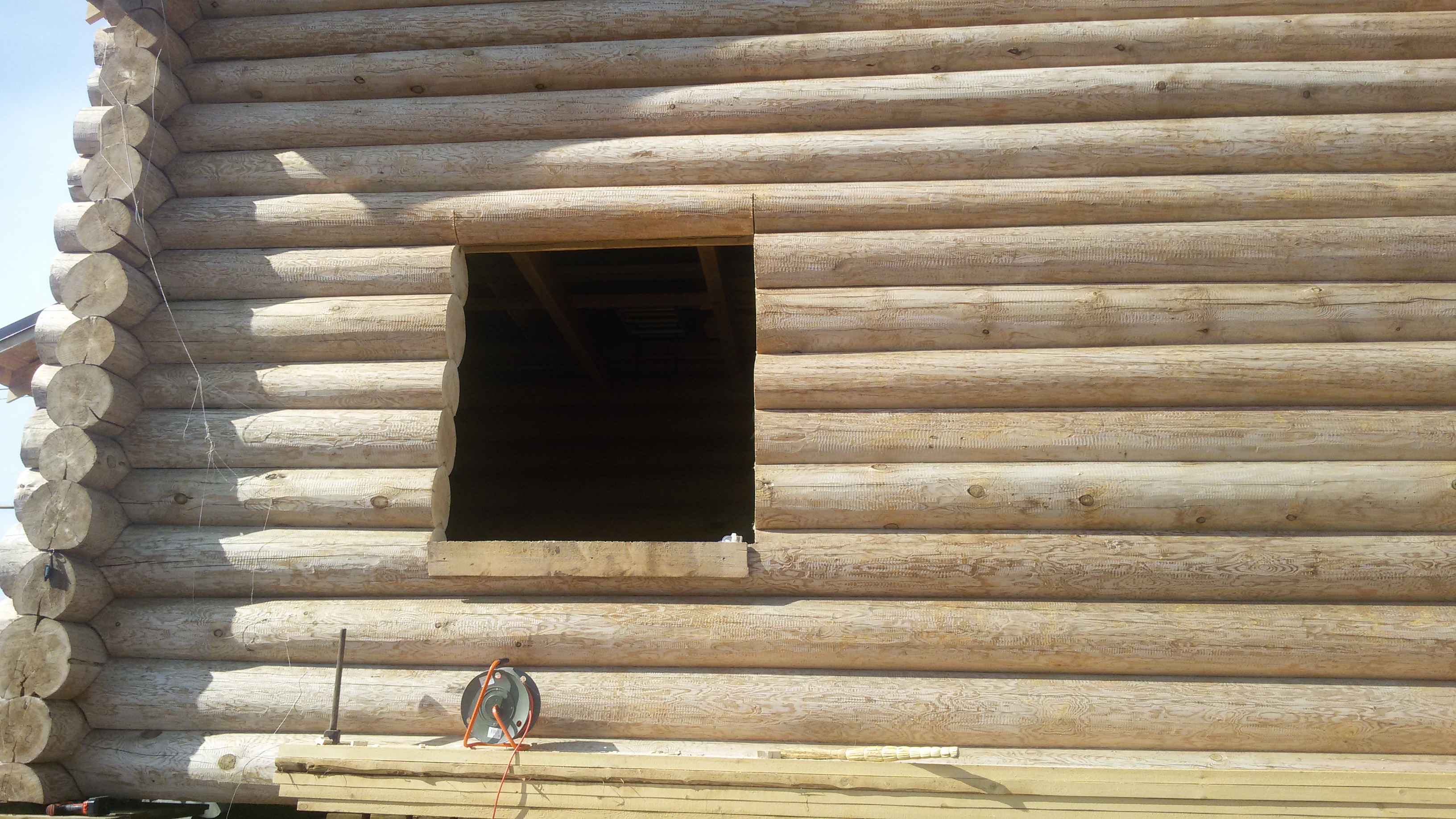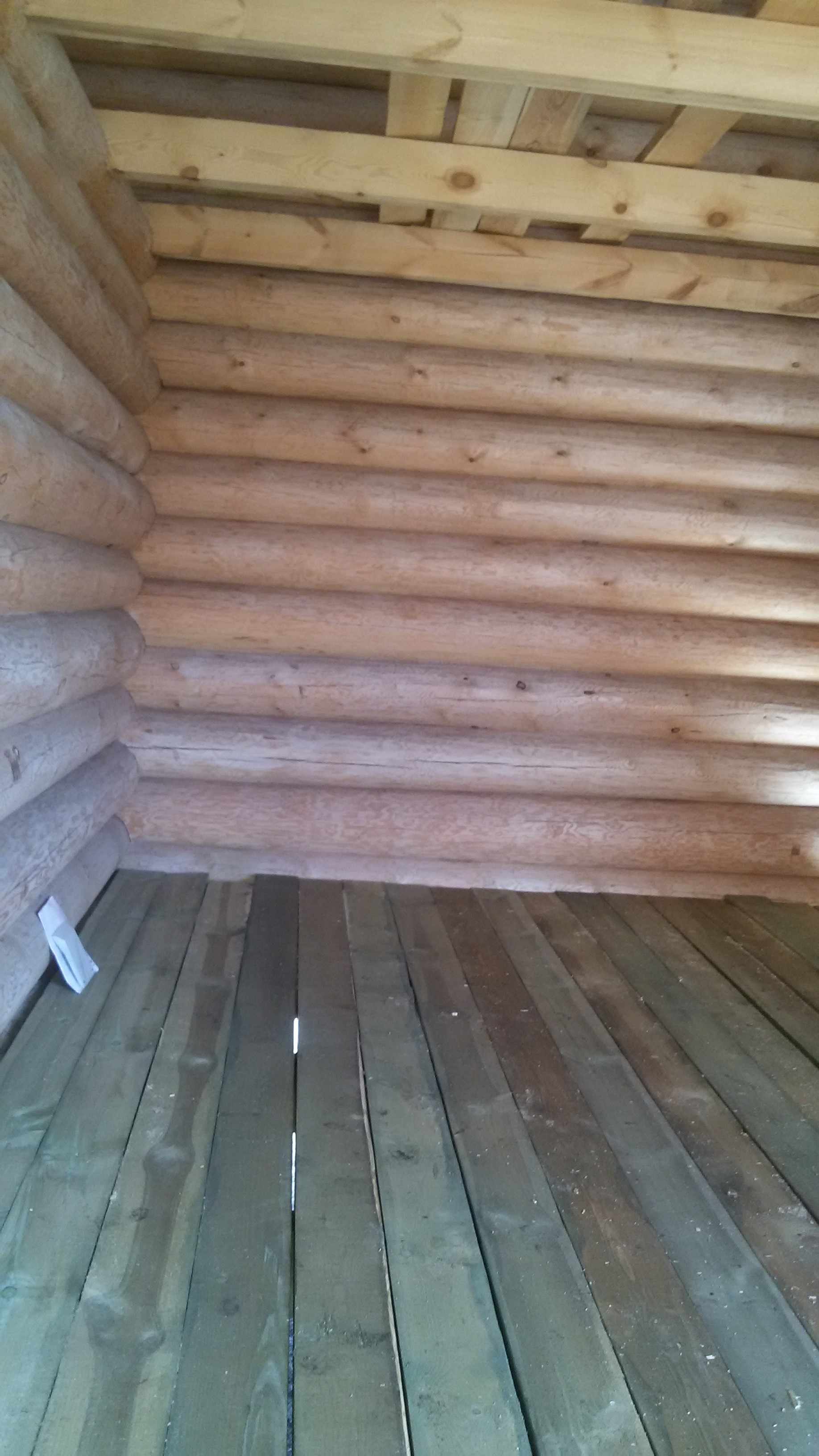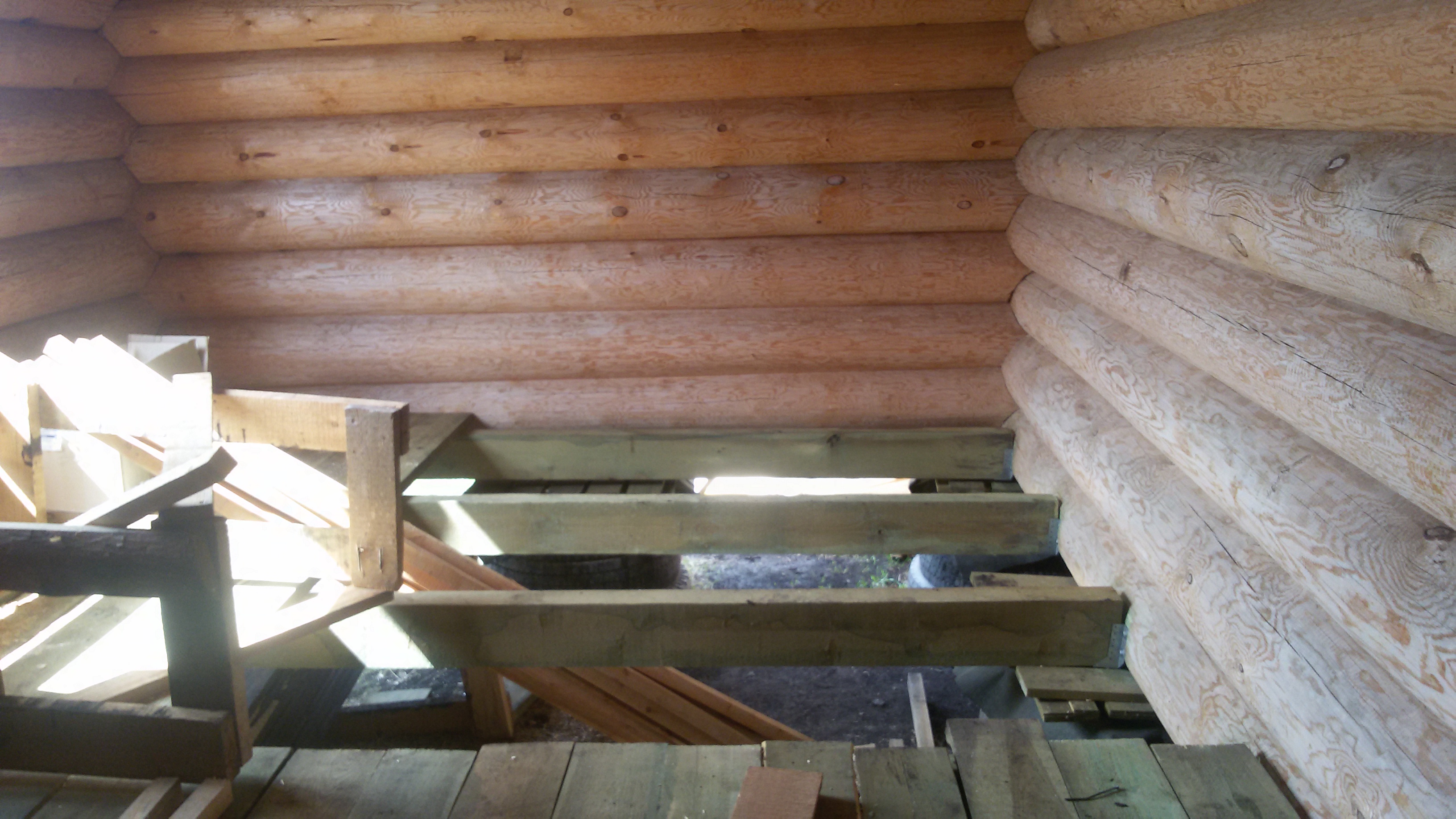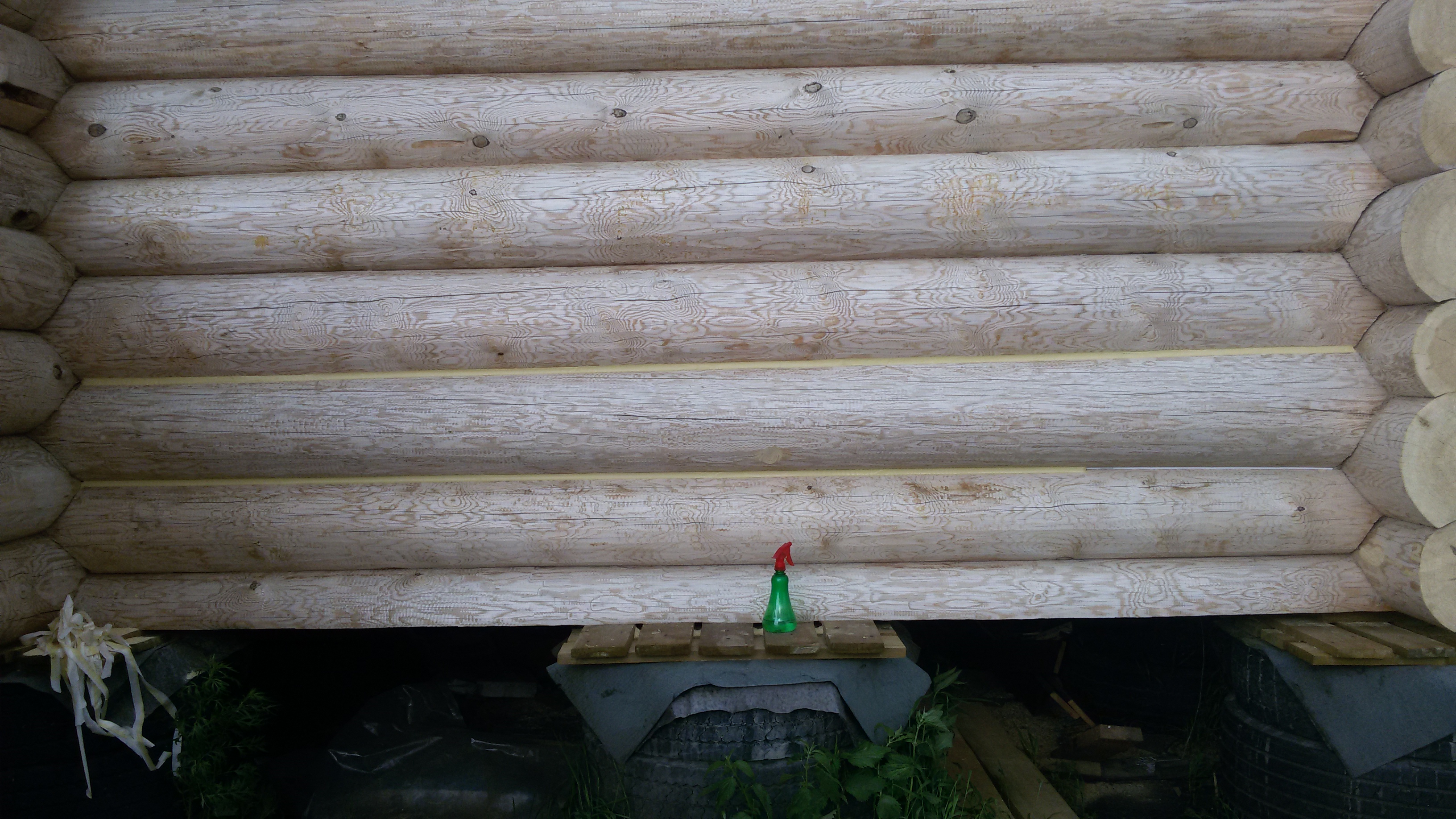 Внутри дома бревна шкурили. Самое начало.