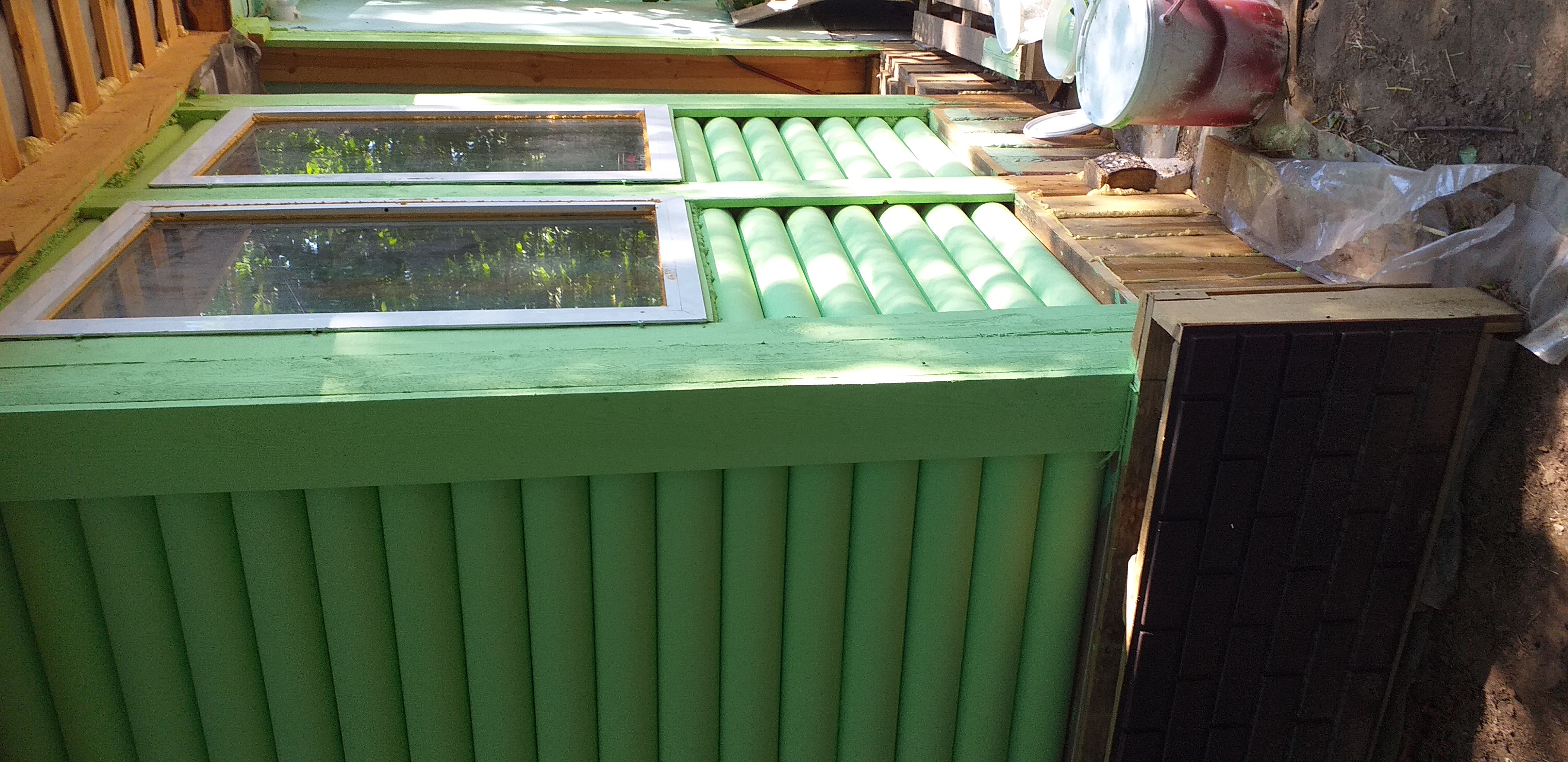 Это опять не кусок стены, а кусок пола.Т.к. у нас достаточно поликарбоната сильно б\у, то мы его кладем под пенопласт. Чтобы поменьше засыпать, укладываем пенопласт сначала полосами, а потом уже засыплем.