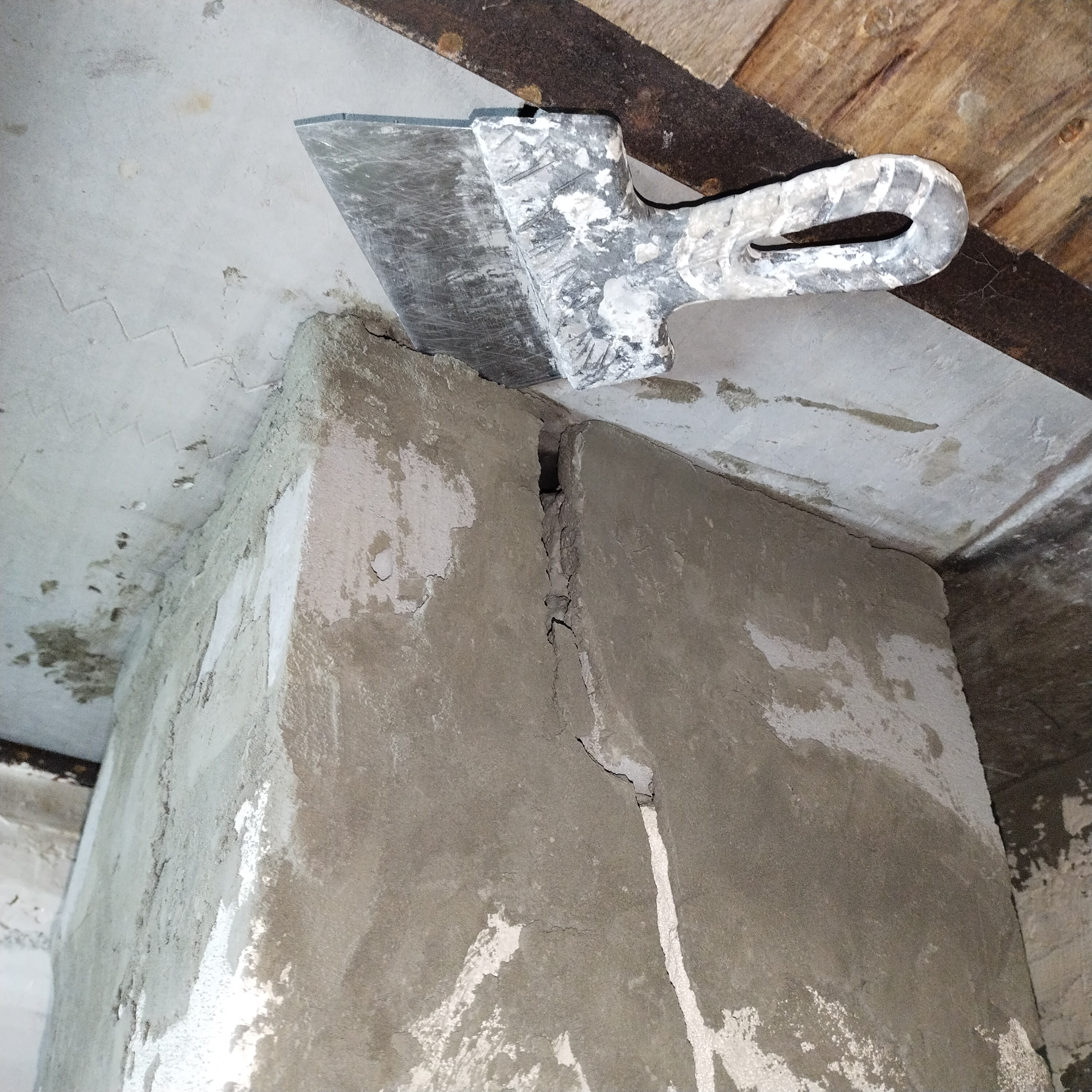 Да кто б спорил. Понадеялся на "липкость" кладочных швов. Там снизу (то, что светлее и лежит на железном "пятаке") цельный кусок блока с пробуренным круглым каналом. А сверху - 4 "кирпичика", сложенных "колодцем". Вот эдак вот: Сначала, как я понял, оно оторвалось от трёх блоков, закреплённых в потолке. Там даже щель организовалась: