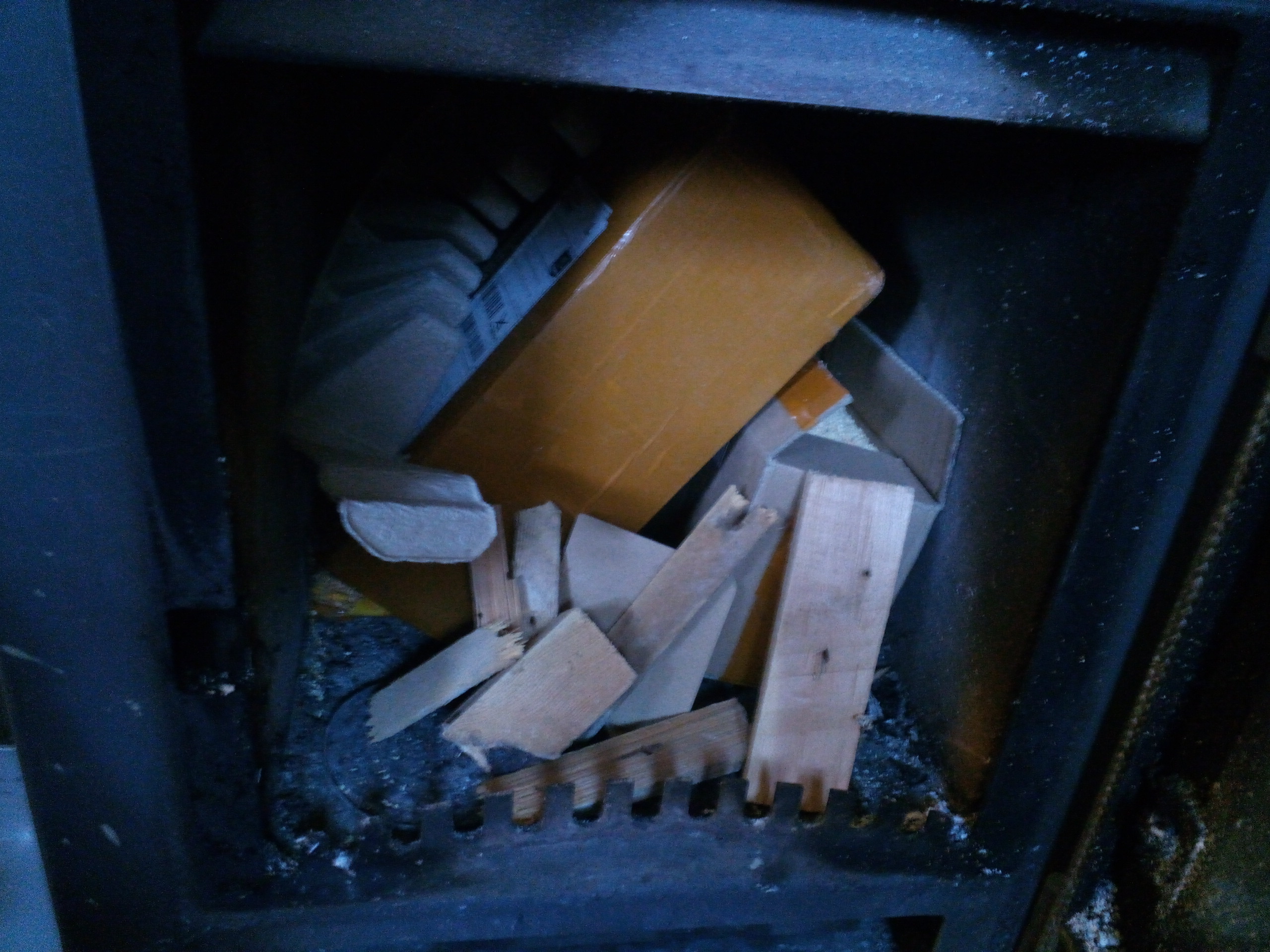 Подбираю всякие коробочки из картона, что бы в топку входили.