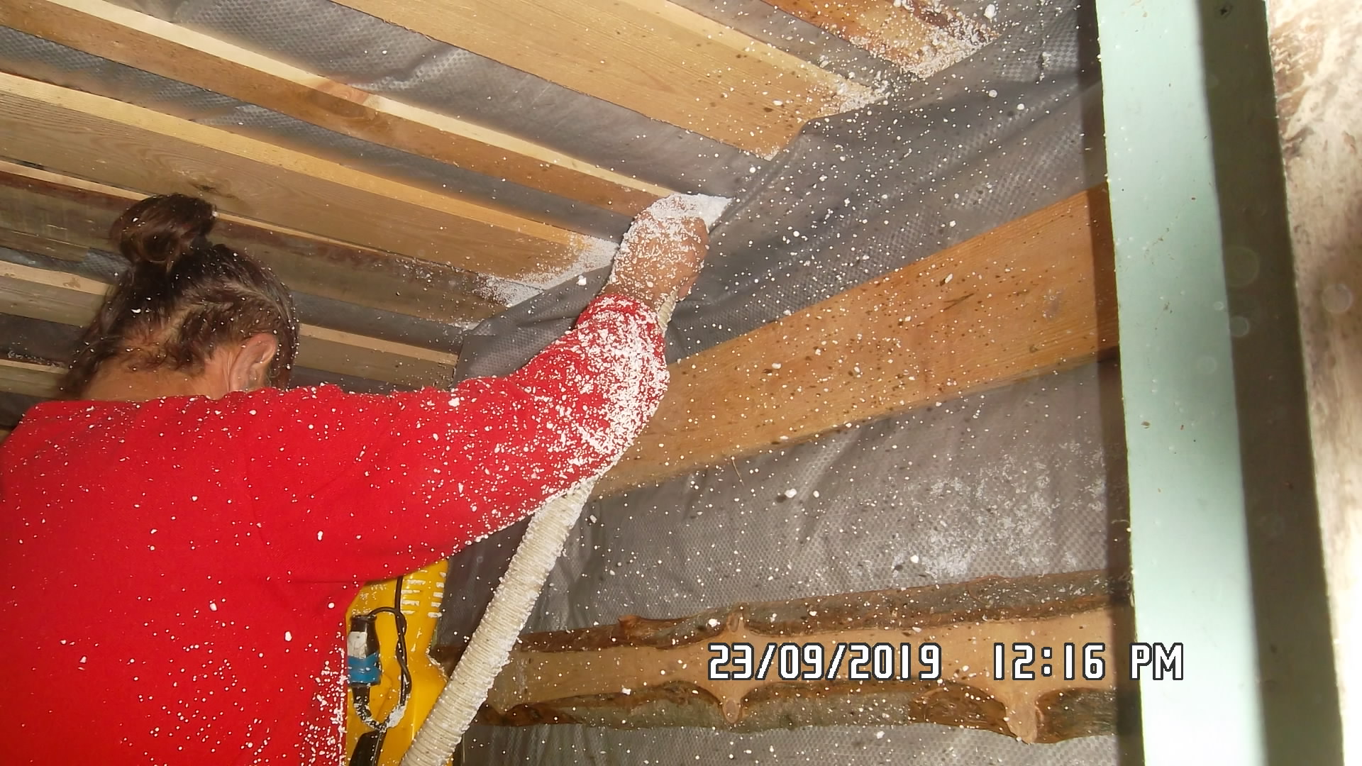 Вот так задуваем в верхнюю часть стены. Нижнюю часть на 1.5 м засыпали вручную, так проще было.Пока заделали полностью только эту стенку.