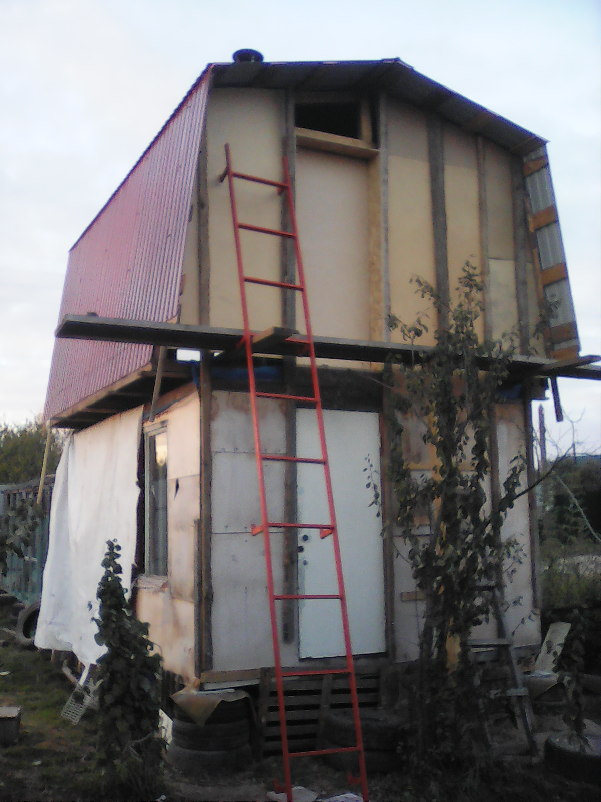 Внешний вид пока такой. Мансарда будет утепляться опилками, а внешний фасад отделываться необрезной брашированной доской внахлёст.