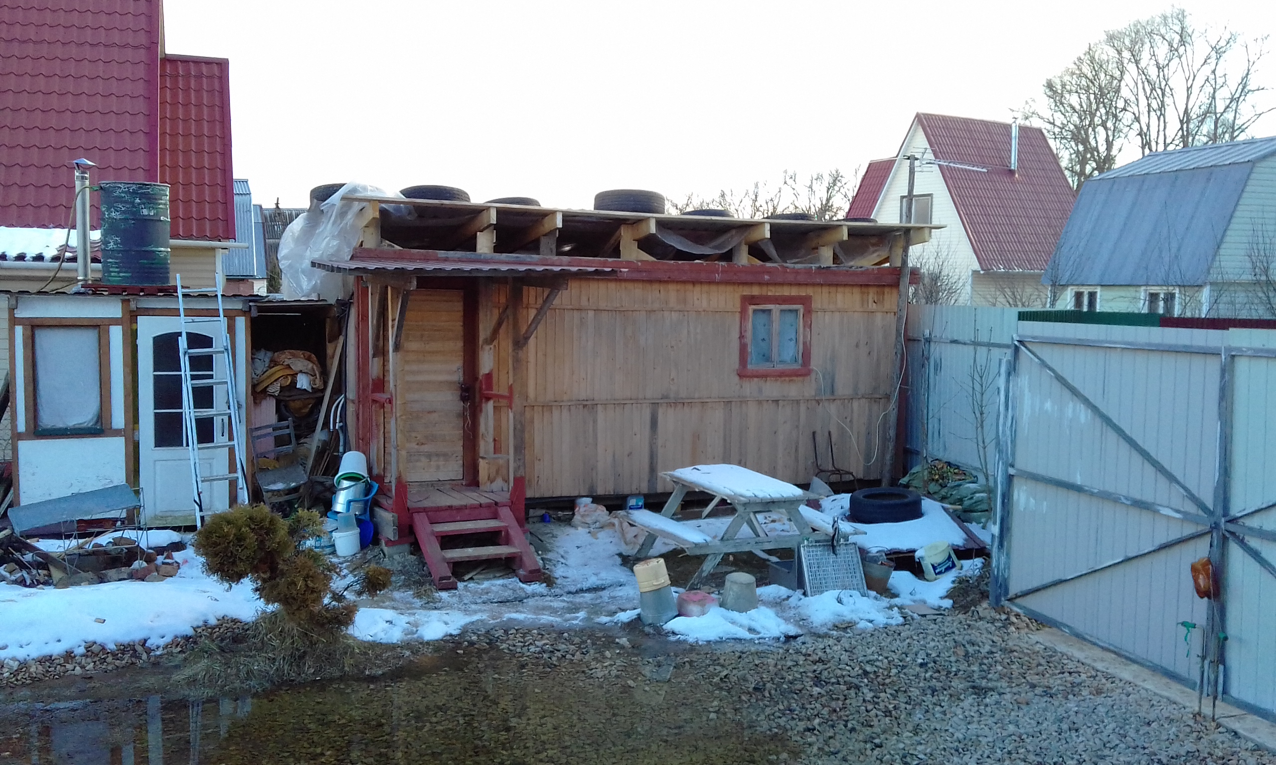 Купил наплавляйку. Сейчас снег сошел, и ливни были - вроде не протекает, поэтому сначала всё-таки возьмусь за стены, а потом за кровлю.