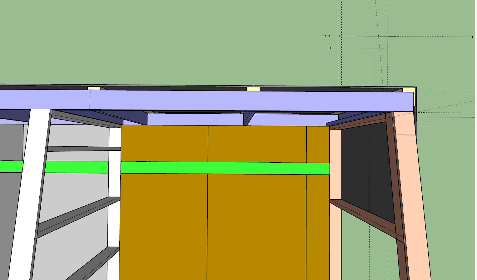 Вот схема для наглядности. Сиреневый - доски каркаса 150х40. Желтый - вертикальная обрещётка 100х40. Темно серый - листы ЦСП.