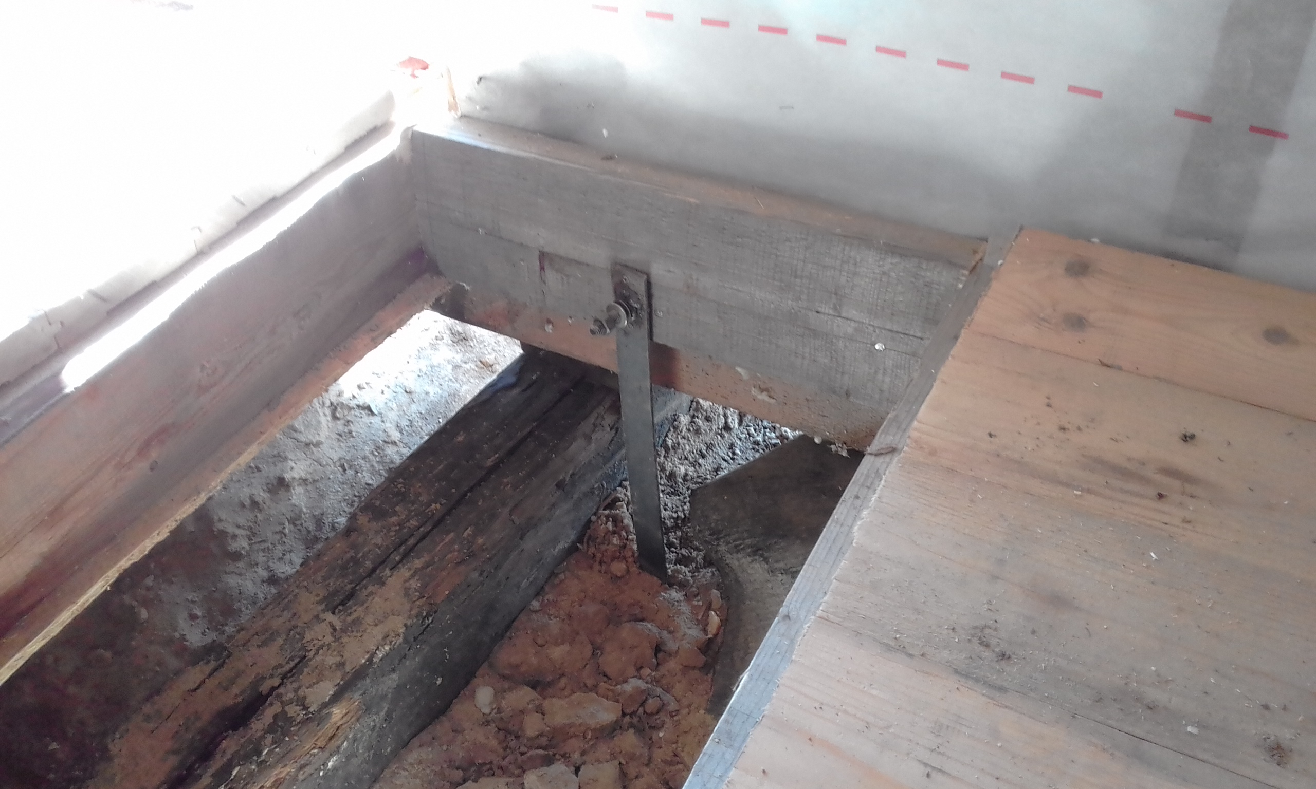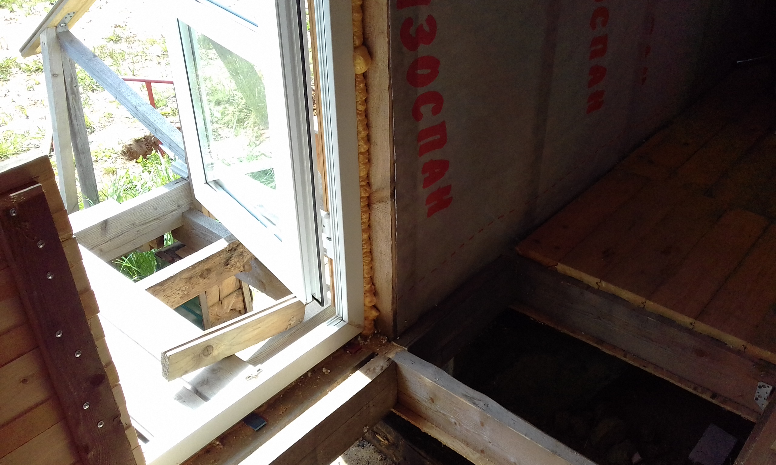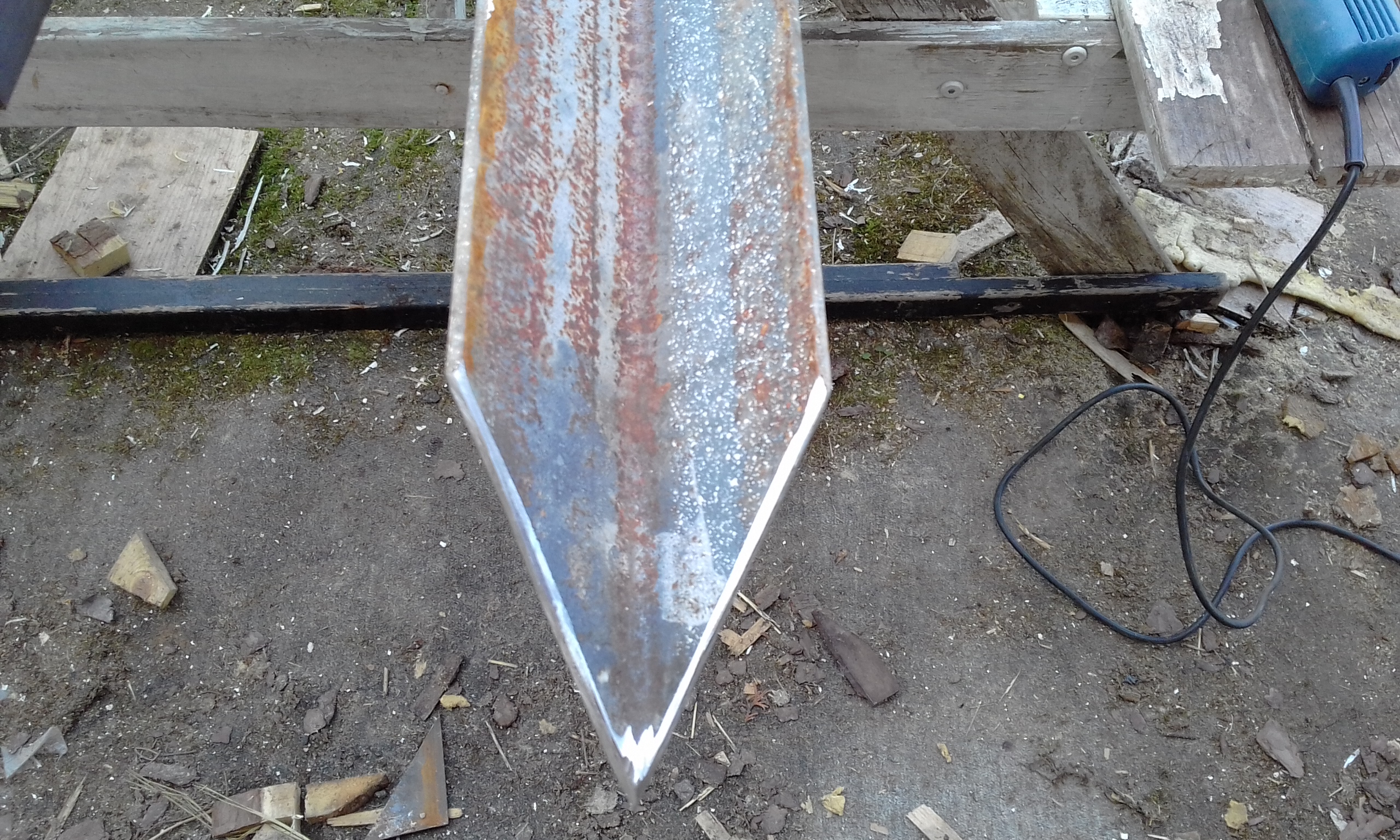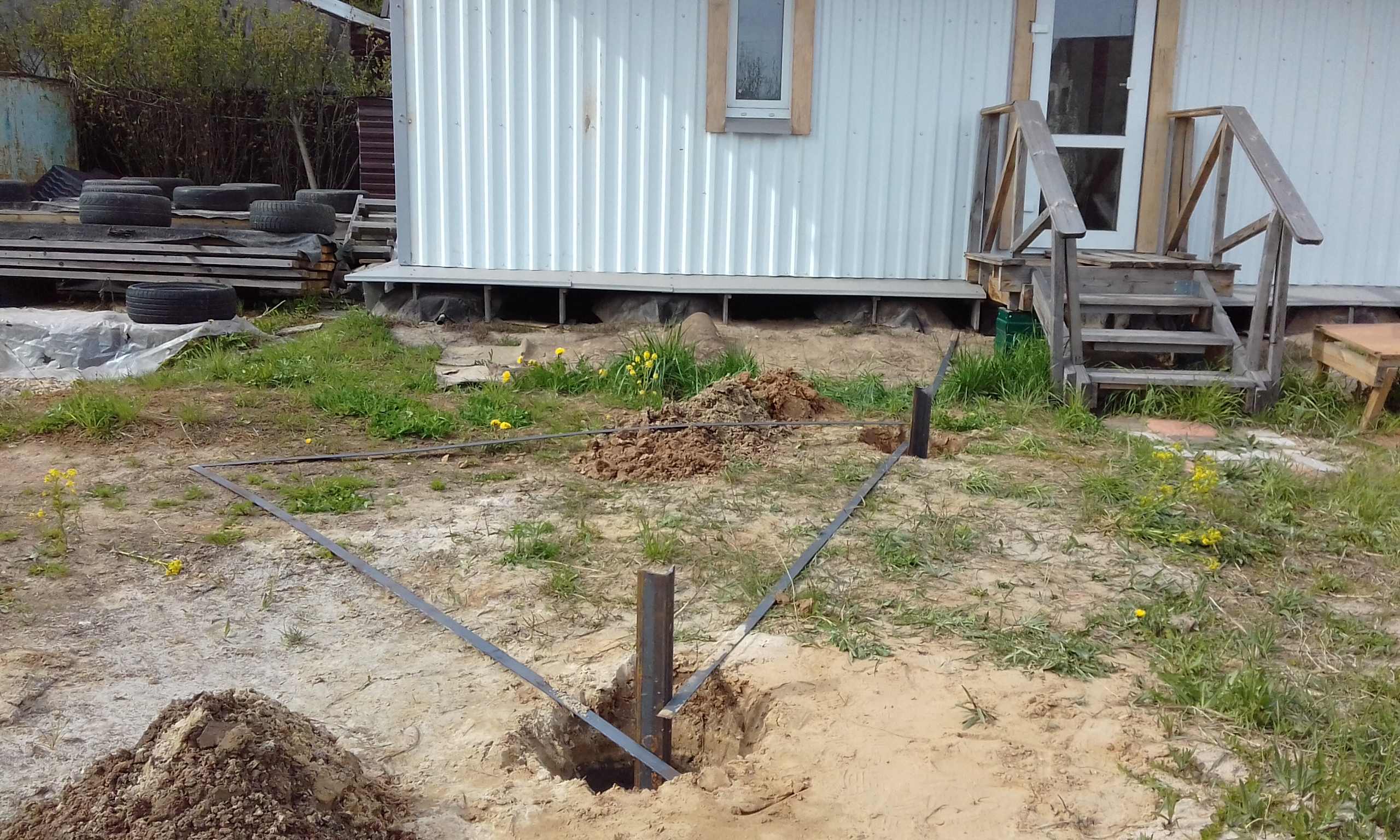 Здесь в подполье на нижней обвязке будет расположена главная шина заземления. Уложил полосу от главной шины заземления до первого электрода. Получилось расстояние от стены до электрода 2,6 м. С помощью болгарки обрезал на конус и заточил конец первого электрода, чтобы лучше входил в землю. Электрод вгонял небольшой кувалдой. Дело шло туго. Решил купить кувалду максимально тяжёлую и с длинной ручкой. Второй электрод обрезал поострей, но это существенно на производительность процесса забивания не повлияло.