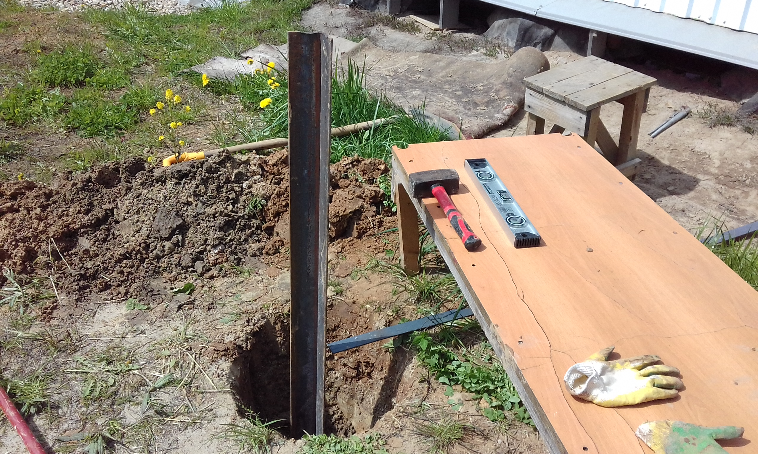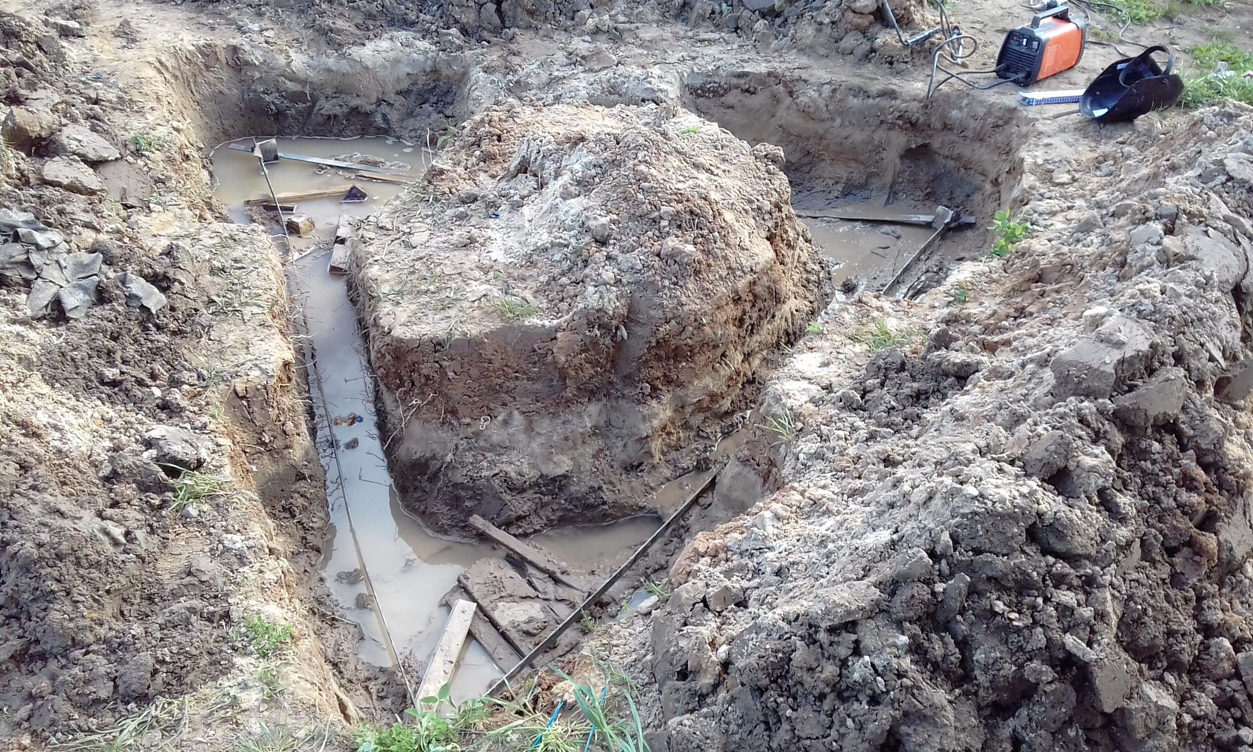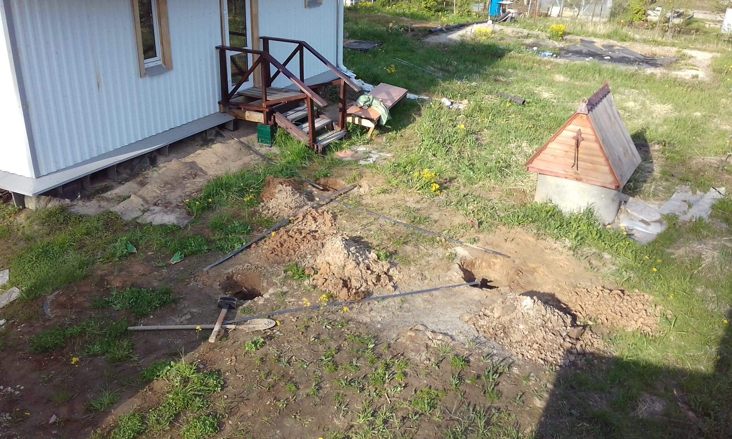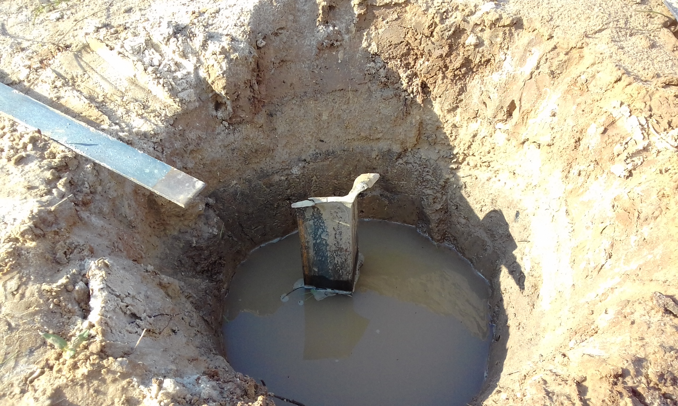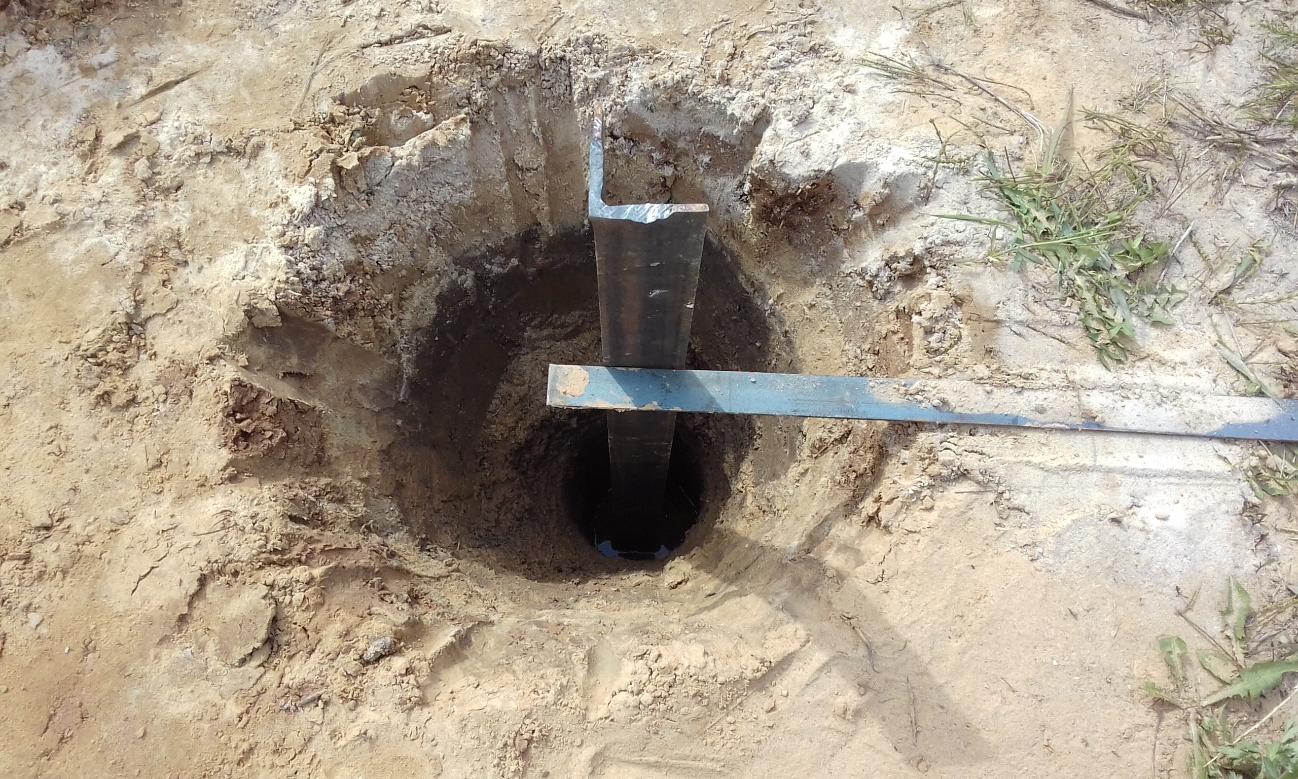 При бурении лидерной шахты верховодка появилась на глубине 80 см. Летом она уйдёт. Сейчас в колодце вода стоит на 30 см ниже поверхности земли, а летом будет на отметке - 5 м. Забил насколько получилось второй электрод. Контур треугольника заземления.