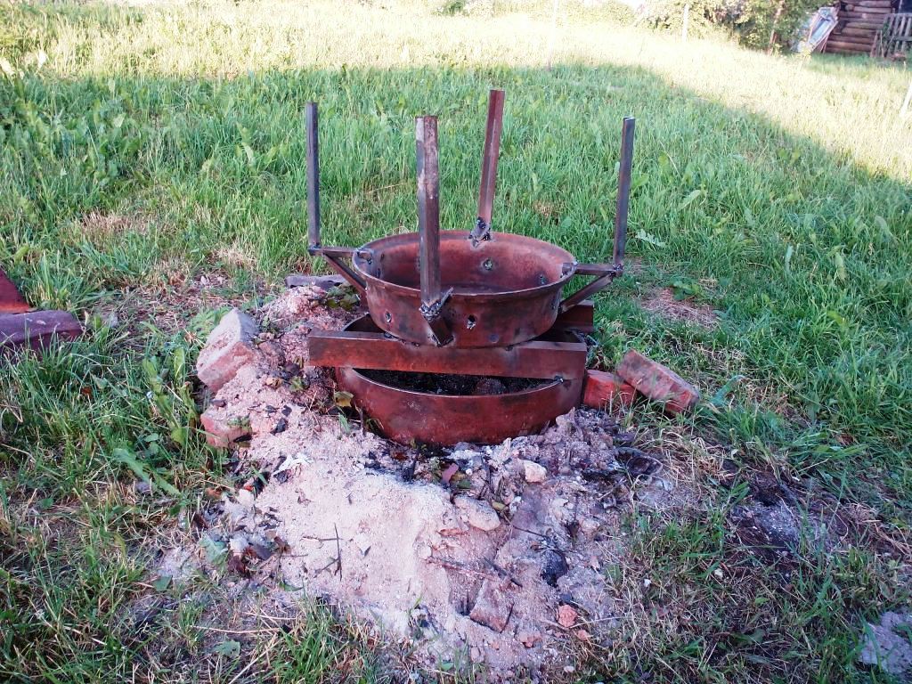 У бочек отгорает низ и его есть смысл делать из всего железа. При этом дно, как ты видишь, воду пропускает, но ядро горения удерживается в чаше диска и на землю не осыпается.Дальше будет так: